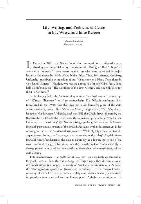 Life Writing And Problems Of Genre In Elie Wiesel And Imre Kertesz Michael Bachmann Academia Edu